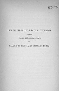 MonographieLes maîtres de l'Ecole de Paris dans la période préspécialistique des maladies du pharynx, du...