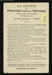 ImageLa société de préservation contre la tuberculose (éducation populaire) fondée en 1900. 33, rue Lafayette...