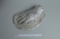 Objet physiqueMain gauche. Les doigts sont repliés. Le plâtre est peint en jaune.
