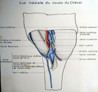 ImageVue médiale du coude du cheval. Encre aquarellée.