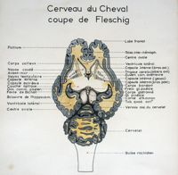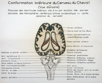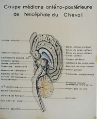 ImageCoupe médiane antéro-postérieure de l'encéphale du cheval. Dessin aquarellé.