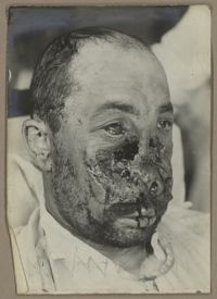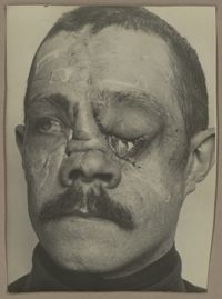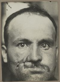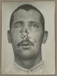 Image[Portrait de face avec lésion traumatique du nez, avant pose de prothèse nasale.]