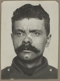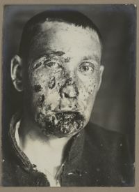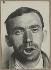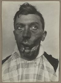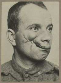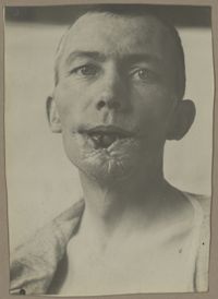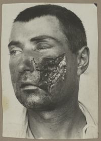 Image[Portrait de trois quarts à gauche avec plaie étendue de la joue gauche à la...