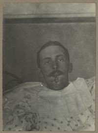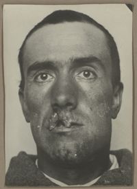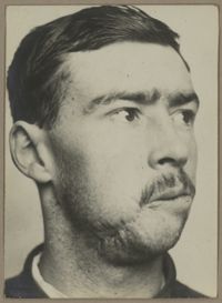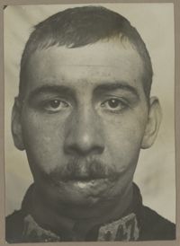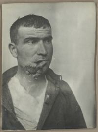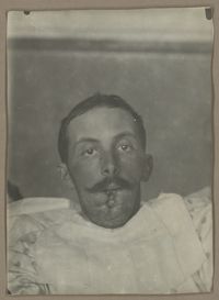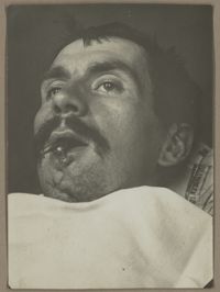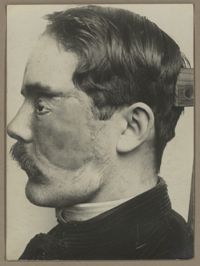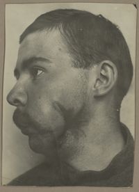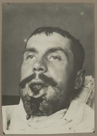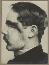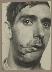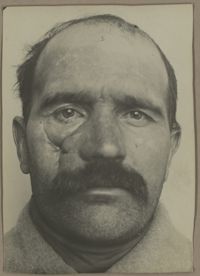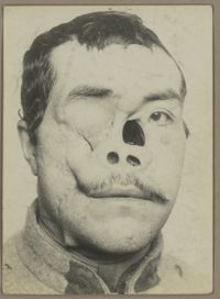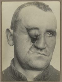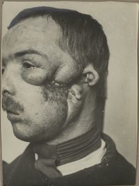 Image[Portrait de trois quarts à droite montrant une perte de l'œil droit et une plaie...