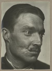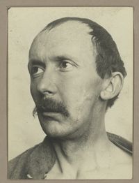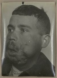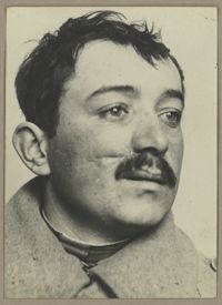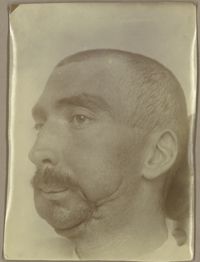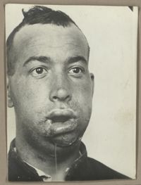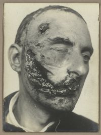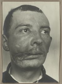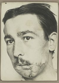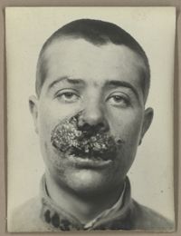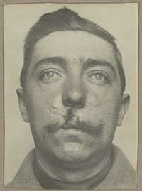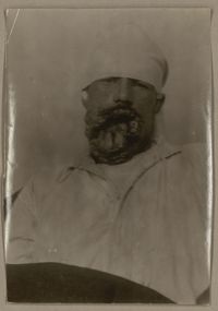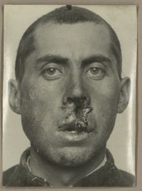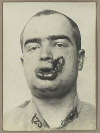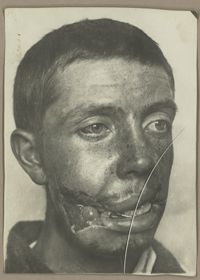 Image[Portrait de face, en buste, préopératoire montrant un traumatisme des maxillaires avec très importante perte...