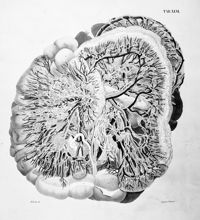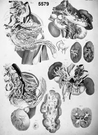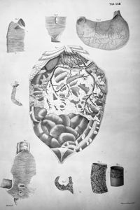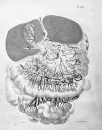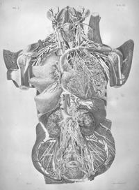 ImageDistribution des artères coeliaque, mésentériques, supérieure et inférieure, et les plexus nerveux du même nom,...