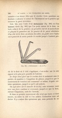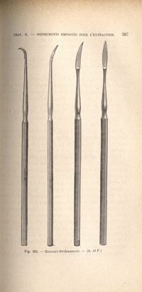 Image[Fig.335. à 337. Syndesmotomes du Dr Chompret / Fig.338. Bistouri pour décapuchonner les dents de...