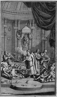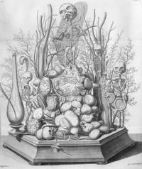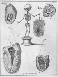 Image[Diorama : 5 squelettes d'enfants autour d'un monticule de calculs et de divers organes momifiés]