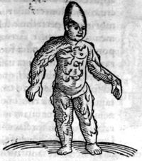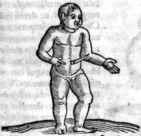 Image[Enfant né avec la tête allongée et le ventre ouvert, laissant voir les intestins à...
