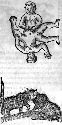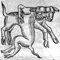 Image[Chevreau du flan duquel sort une corne et veau bicéphale avec des yeux au niveau...
