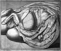 Image[Planche représentant la vessie remplie d'urine (A), le rectum (G)]
