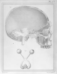 Image[Coupe verticale de la tête et de la cavité orbitaire ; les nerfs optiques depuis...
