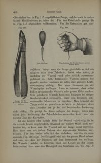 Image[Fig.115. Pince pour les racines de la mâchoire supérieure / Fig.116. Elévateur (A) et manière...
