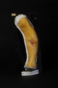 Objet physiqueTroubles trophiques consécutifs à une fracture de jambe ancienne. Cal vicieux, jambe arquée. Deux ulcérations...