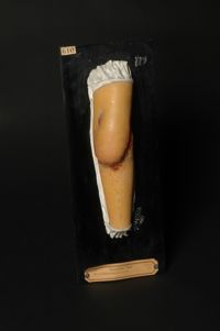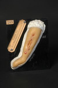 Objet physiqueNécrose du radius, chez un enfant. On voit l'os nécrosé à travers la plaie