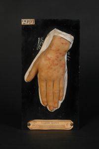 Objet physiqueLésions desquamatives kératosiques, accompagnées d'éruption pustuleuse de la main et des doigts, chez un syphilitique...