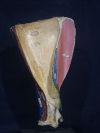 Objet physiqueTibia du boeuf, avec les insertions musculaires coloriées, préparé par Petitcolin