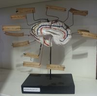 Objet physiqueCerveau du cheval, face interne, en plâtre colorié. sulci peints, légendé.