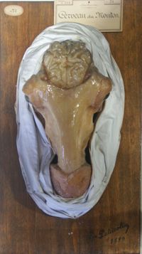 Objet physiqueCerveau du mouton. En place dans la cavité crânienne. Moulage colorié (cire).