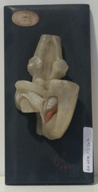 Objet physiqueCerveau du cheval, coupes horizontales 3 pièces -1 plâtre colorié, légendé.