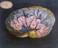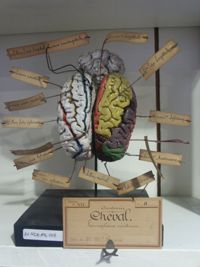 Objet physiqueCerveau du cheval, localisations cérébrales en couleur.moulage en plâtre ; gyri peints à droite, sulci...