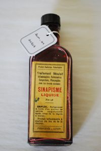 Objet physiqueFlacon sinapisme liquide. Traitement répulsif des inflammations pulmonaires, congestions, pharyngites chez les grands animaux
