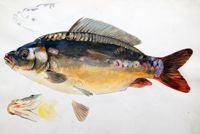 ImageCarpe miroir : profil et gorge. Plaques du dessus de la tête. Détail d'une nageoire