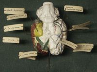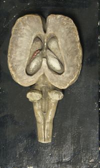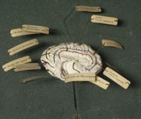 Objet physiqueCerveau du cheval, localisations cérébrales en couleur. moulage en plâtre ; gyri peints à gauche,...