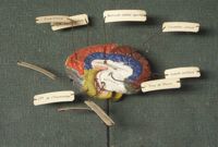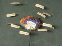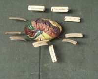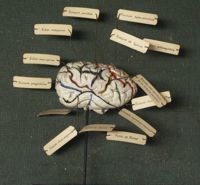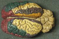 Objet physiqueCerveau du cheval, localisations cérébrales en couleur. moulage en plâtre ; gyri peints des 2...