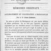 0289 - Page 290 - Mémoires originaux. Acclimatement et colonisation à Madagascar. Par le Dr Jean Lémure. Conditions de l'acclimatement