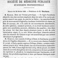 0359 - Page 360 - Société de médecine légale de France. Séance du 10 février 1896. Présidence de M. Constant, vice- président. Traumatisme crânien suivi de troubles cérébraux. Par M. le Dr Vallon / Société de médecine publique et d'hygiène professionnelle. Séance du 26 février 1896. Présidence de M. Duclaux. Note sur l'ivresse pétrolique. Les couverts d'alliage d'étain et d'antimoine au point de vue d'hygiène alimentaire. Constructions hospitalières. pavillons de diphtériques. La protection légale des femmes dans l'industrie, d'après la législation actuelle des différents pays
