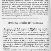 0456 - Page 456 - Société d'hygiène publique et de génie sanitaire. Séance des 12 et 20 juin 1901. La lutte contre la tuberculose ; maladie populaire, par le sanatorium, établissement de cure et école de prophylaxie. Le sanatorium populaire antituberculeux, oeuvre de solidarité et de préservation sociale / Revue des intérêts professionnels. Le patron qui fait soigner à l'hôpital son ouvrier blessé doit-il des honoraires au médecin ?