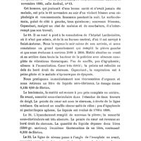 0425 - Page 422 - Mémoires originaux. Pleurésies avec épanchement observées dans le service de M. Dieulafoy. (Hôpital Saint-Antoine, année 1883.) Par Paul Binet... Obs. XV. — Pleurésie hémorrhagique gauche symptomatique d'un cancer pleuro-pulmonaire. — Six ponctions. — Cancer du cervelet. — Mort / Obs. XVI. — Pleurésie hémorrhagique tuberculeuse. — Sept ponctions ; le liquide cesse d'être hémorrhagique à partir de la sixième ponction