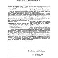 0257 - Page 256 - Index bibliographique. De l'hystérie chez les enfants, par le Dr Peugniez. (Thèse de Paris, Ad. Delahaye, 1885.) / De la broncho-pneumonie cholérique, par M. Aug. Dubreuilh. (Thèse de Paris, 1885, Steinheil.)