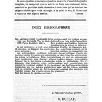 0762 - Page 762 - Bibliographie. Recherches sur l'anatomie normale et pathologique de la glande biliaire chez l'homme, par le Dr Ch. Sabourin (... Paris, 1888) / Index bibliographique. Recherches sur les premières phases du développement de l'oeil chez le lapin. (Vassaux, Th. doct., 1888.)
