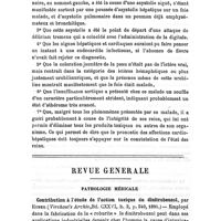 0478 - Page 478 - Revue clinique. Revue clinique médicale. Hôpital Saint-Antoine. — Service de M. Hanot. Alcoolisme. — Vomissements de sang répétés à longue distance. — Teinte jaune verdâtre (septicémique) de la peau. — Purpura. — Oedème de la face et des jambes. — Cachexie commençante. — Sensation d'empâtement épigastrique. — Foie gros. — Absence d'albumine. — Mort avec accidents pulmonaires et température élevée. — Autopsie: gros foie tuberculeux alcoolique et cirrhotique. — Tuberculose pulmonaire. Observation recueillie par Paul Gastou... / Revue générale. Pathologie médicale. Élimination azotée dans les maladies du rein, par J. Maun (Zeit. für Klin. Med., 1892, Bd. XX, Hft 1 et 2, p. 107)