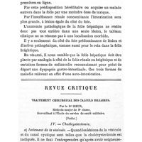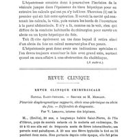 0218 - Page 218 - Revue critique. Traitement chirurgical des calculs biliaires. Par le Dr Sieur... (Suite.) (A suivre.) / Revue clinique. Revue clinique chirurgicale. Hôpital Saint-Antoine. — Service de M. Merklen. Pleurésie diaphragmatique suppurée, abcès sous-phrénique ou abcès du foie. — Difficultés de diagnostic. Par V. Leblond..