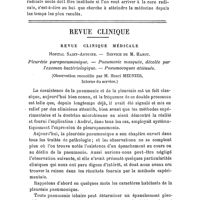 0100 - Page 100 - Revue clinique. Revue clinique médicale. Hôpital Saint-Antoine. — Service de M. Hanot. Pleurésie parapneumonique. — Pneumonie masquée, décelée par l'examen bactériologique. — Pneumocoques atténués. (Observation recueillie par M. Henri Meunier...) / Revue générale. Pathologie médicale. Sur la dégénérescence hépatique aiguë streptococcique, par Babes. (Archiv für path. Anat. de Virchow, 5 avril 1894.)