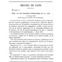 0448 - Page 444 - Mémoires originaux. Le chancre simple (chancre mou, chancre non infectant) de la région céphalique. Par le D Eudlitz (A suivre.) / Autopsie de la malade sujet du travail intitulé : Diplégie faciale totale d'origine artérielle. Publié dans le numéro des Archives de janvier 1896. Par Le Dr Labadie-Lagrave...et Le Dr Emile Boix..