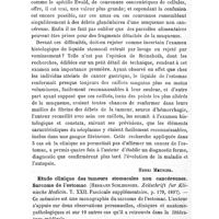 0772 - Page 753 - Revue analytique. Diagnostic du cancer de l'estomac par les liquides du lavage et par les matières du vomissement, par Reineboth (Deutsch. Arch. f. klin. Med. Bd LVIII, 1897). / Etude clinique des tumeurs stomacales non cancéreuses. Sarcome de l'estomac. (Hermann Schlesinger. Zeitschrift für Klinische Medicin. T. XXII. Fascicule supplémentaire, p. 179, 1897)