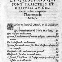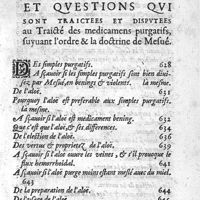 0017 - Page sans numérotation - Estat des matieres et questions qui sont traictees et disputees au Traicté des medicamens purgatifs, suyvant l'ordre et la doctrine de Mesué