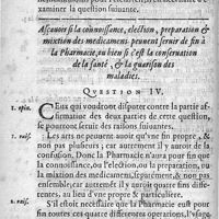0044 - Page 20 - A sçavoir si la connoissance, election, preparation et mixtion des medicamens peuvent servir de fin à la Pharmacie, ou bien si c'est la conservation de la santé, et la guarison des maladies. Question IV