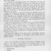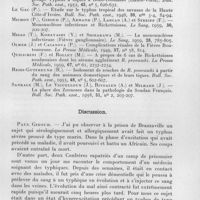 1070 - Page 965 - Séance du 14 décembre 1960. Mémoires. Comparaison entre Rickettsia sennetsui et Rickettsia tsutsugamushi : morphologie, pouvoir pathogène, pouvoir antigénique, par P. Giroud, M. Capponi et N. Dumas. / Sur quelques lysotypes exotiques de Salmonella typhi découverts par le Centre Français de la Lysotypie Entérique, par P. Nicolle, G. Diverneau, J. Brault et A. M. Du Plessis