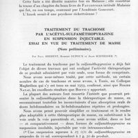 0239 - Page 216 - Séances des 9 mars et 13 avril 1960. Mémoires. Traitement du trachome par l'acétyl-sulfamétholpyrazine en suspension injectable. Essai en vue du traitement de masse (Note préliminaire). Par Paul Bierent, Robert Dupoux et Jean Schneider. (Hôpital Charles-Nicolle et Dispensaire Sidi-Brahim, Tunis.). / Rickettsioses et affections cardio-vasculaires (A propos de 13 observations, dont 12 cardiopathies) par G. Delanoe. Introduction