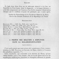 1002 - Page 913 - Sociétés correspondantes. Société des sciences médicales de Madagascar. II. - Séance du 5 juillet 1960. 4) Contribution à l'étude du traitement des accidents oculaires dans l'intoxication quininique, par J. Goulesque. / 5) Les fractures de la 1re côte. Considérations étiologiques, pathogéniques et diagnostiques à propos d'une observation, par P. A. Hervé et J. Bourlaud. / III. - Séance du 12 juillet 1960. 1) Tumeur génitale et grossesse. Réflexions à propos de 5 observations par P. A. Hervé et J. Bourlaud. / 2) A propos du diagnostic des tumeurs médiastinales, par J. Merlihot, J. C. Carré et G. Faugères