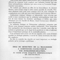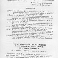1004 - Page 915 - Société médicale d'afrique noire de langue française. Séance du 11 juillet 1960. Un cas d'anévrysme myocardique calcifié avec tachycardie ventriculaire réversible (présentation de malade), par M. Payet, M. Sankale, P. Koate et A. Pallegrino. / Un cas de péricardite calcifiante avec syndrome de Pick, chez une femme africaine (présentation de malade), par M. Payet, M. Sankale, P. Pineau et O. Bao. / A la recherche de la syphilis endémique. Enquête effectuée dans l'est de la Mauritanie, par H. Boiron et A. Basset. / Application du test de Brunet-Lézine aux enfants dakarois, par Mmes G. Bardet, G. Masse, F. Moreigne et M. Sénécal