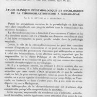 1001 - Page 912 - Sociétés correspondantes. Société des sciences médicales de Madagascar. I. - Séance du 7 juin 1960. 4) Quelques observations de rhumatisme inflammatoire chez le Malgache, par J. Merlihot, R. Granier et Grelat. / II. - Séance du 5 juillet 1960. 1) Échec du traitement par la griséofulvine dans 4 cas de chromoblastomycose par A. Capron, A. Dodin et Andrianantsoa. / 2) Un cas de syndrome d'Albright (présentation de malade), par P. Navarranne et C. Plan. / 3) Un cancer caché : métastases ostéolytiques révélatrices d'un cancer de la thyroïde découvert à l'autopsie, par J. Prat, Ed. Bertrand et J.-C. Carré. / 4) Contribution à l'étude du traitement des accidents oculaires dans l'intoxication quininique, par J. Goulesque