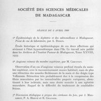 1179 - Page 1070 - Sociétés correspondantes. Société des sciences médicales de Madagascar. Séance du 4 octobre 1960. 4° Hypertension artérielle maligne essentielle chez une enfant de 10 ans, par Hervé, Peyrot, Carrier-Clérambault et Mathé. / 5° Les examens radiologiques systématiques en médecine collective, par Goulesque, Ch. Rakotomalala et S. Andriankova. / 6° Réaction de Meinicke-clarification sur goutte épaisse, par J. Goulesque. / Séance du 8 novembre 1960. 1° Les formes trompeuses du cancer du pancréas, par P. A. Hervé, J. Merlihot, J. Peyrot et R. Carrier-Clérambault