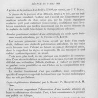 0055 - Page 43 - Séances des 13 janvier et 10 février 1960. Communications. Malformation de la vésicule hydatique dans un volumineux kyste du foie, par G. Cabanié et L. Lamy. (Hôpital du Marshan, Tanger. Institut Pasteur, Service de parasitologie.). / Deux observations d'effets thérapeutiques dans l'onchocercose après des traitements au Mel W (pentylthiarsaphénylmélamine) et au TWSb (dimercaptosuccinate d'antimoine), par Ernst A. H. Friedheim et R. T. de Jongh
