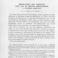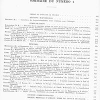 0136 - Page 120 - Sociétés correspondantes. Société médicale d'Afrique Noire de langue française anciennement « Société médicale de l'A. O. F. ». Séance du 7 décembre 1959. Toxoplasmose congénitale chez un enfant noir, par J. Sénécal, A. Pellegrino, M. Larivière et V. Agbessy, avec présentation de malade. / Rhinosclérome ? par J. Reynaud, avec présentation de malade. / Arthroplastie du coude gauche (à la peau) chez un blessé très particulier (grand infirme des 4 membres), par R. Fustec, Atayi et Touré, avec présentation de malade. / Étude effectuée à Dakar, chez l'Africain, des variations physiologiques de la protidémie en fonction de l'âge, par H. Plagnol, M. Castets, M. Mallet et H. Boiron. / A propos de deux formes particulières d'encéphalite typhique, par P. Pène, M. Fernex et A. Bourgeade. / Intérêt de l'hystérosalpingographie dans le diagnostic de la grossesse extra-utérine, par A. Carayon, J. F. Blanc et J. Roigt. / L'éruption dentaire de l'enfant africain durant les trois premières années de la vie, par J. Sénécal, G. Masse et F. Moreigne. / Sur trois cas de tumeurs fibreuses du maxillaire inférieur, par J. Reynaud et Lamine Diop
